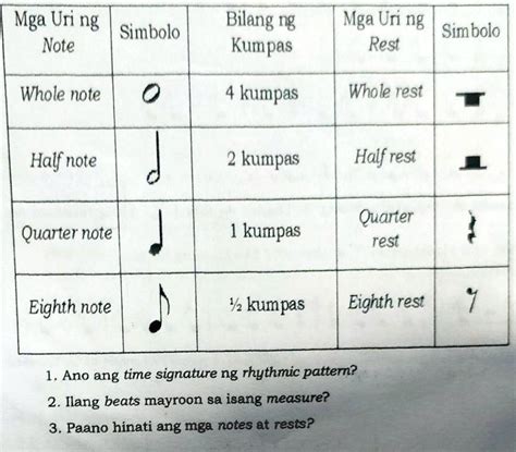 Ang Kumpas Ng Nota ay isang mahalagang konsepto sa larangan ng musika. Ito ay tumutukoy sa marka o tanda na nagpapahiwatig ng takbo o bilis ng isang tunog. Ang wastong pag-unawa sa kumpas ng nota ay isang pundasyon sa pag-aaral at pagganap ng mga piyesa ng musika. Sa pamamagitan ng maayos na pagkakataon at pagsunod sa mga kumpas ng nota, nagiging malinaw ang pagkakabuo ng tunog at nagkakaroon ng kahulugan ang bawat piyesa.